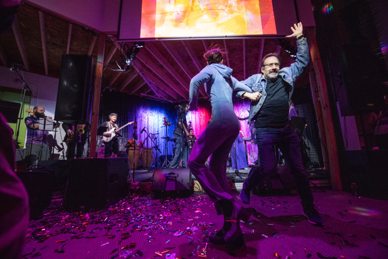 intimate cocktail tables, flexible seating upstairs and down, a den