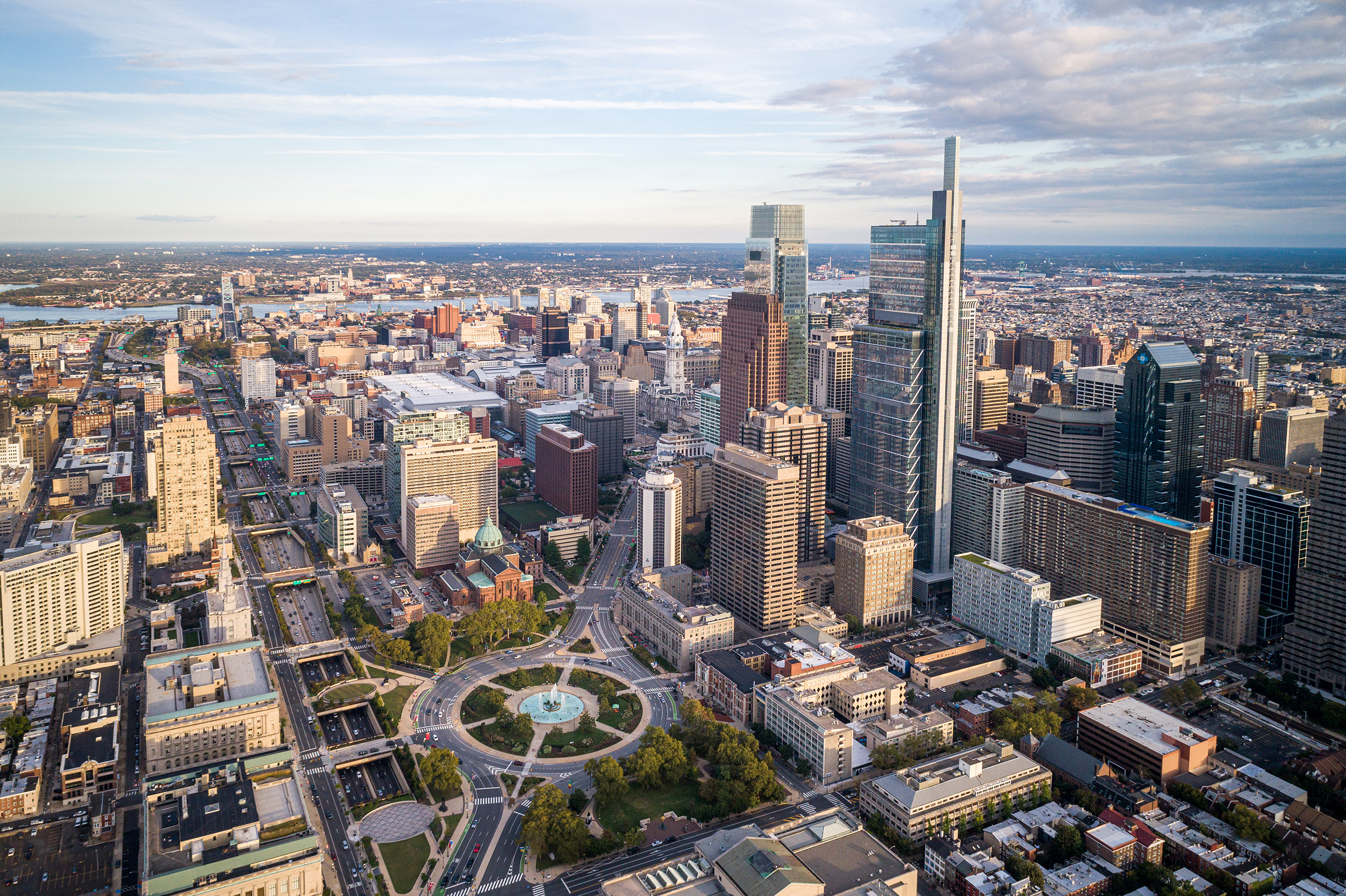 Philadelphia's skyline with bright blue skies.